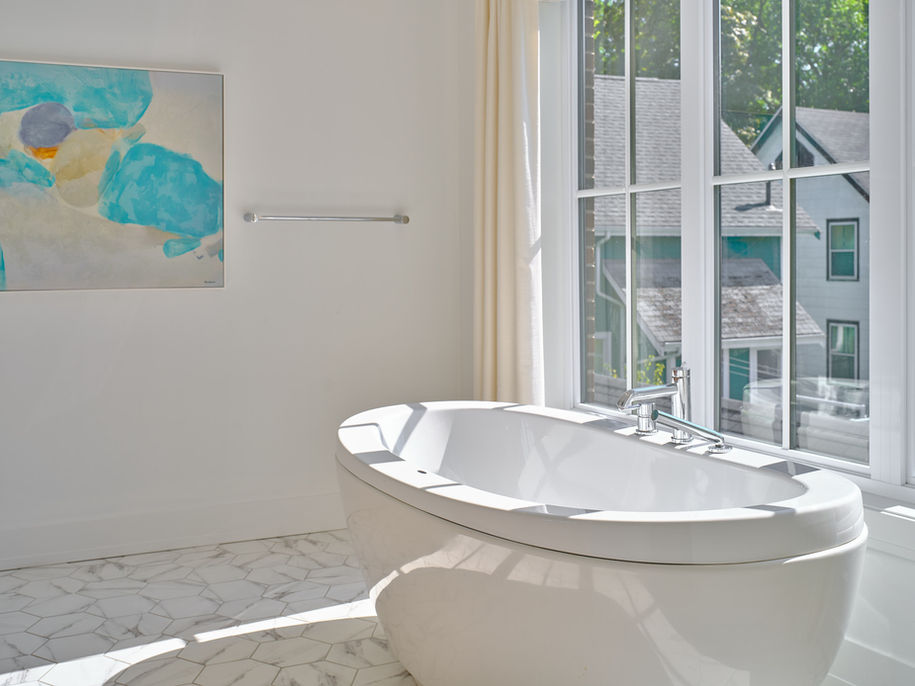 The main level is organized around ease and flow. A formal foyer greets visitors, while a separate mudroom supports the daily comings and goings of family life. A water closet and formal dining room maintain the traditional structure of the original layout, but the living room and kitchen are now open concept, connecting directly to a new back deck for indoor-outdoor living.